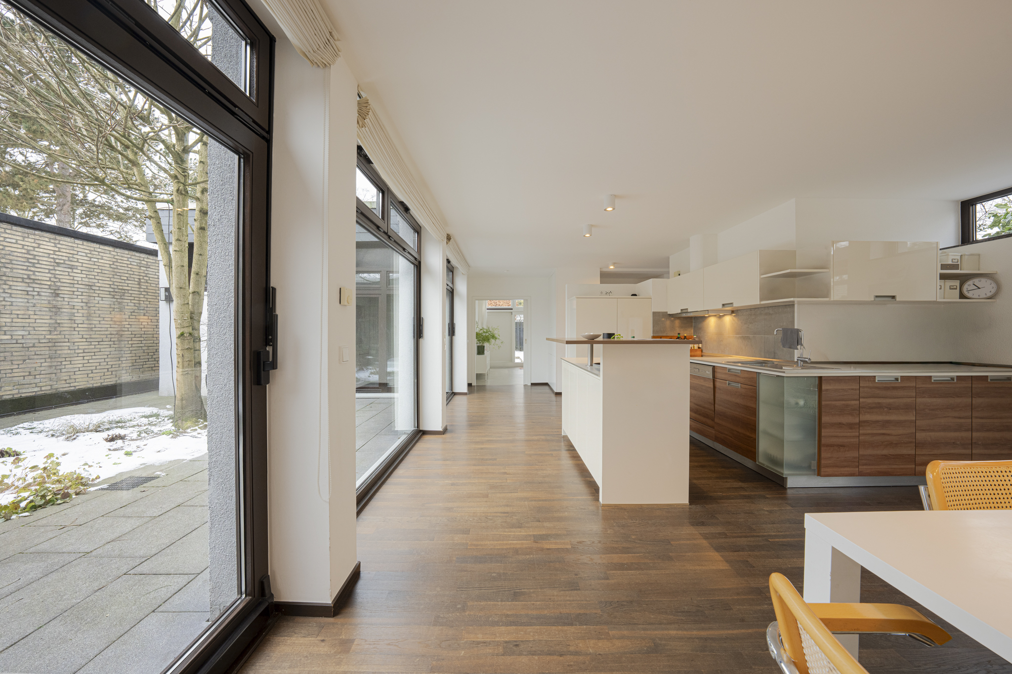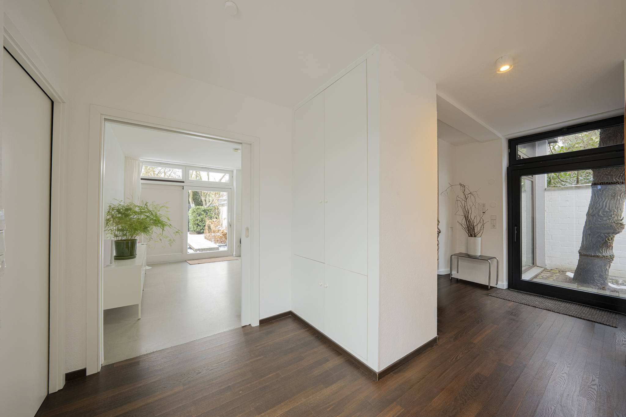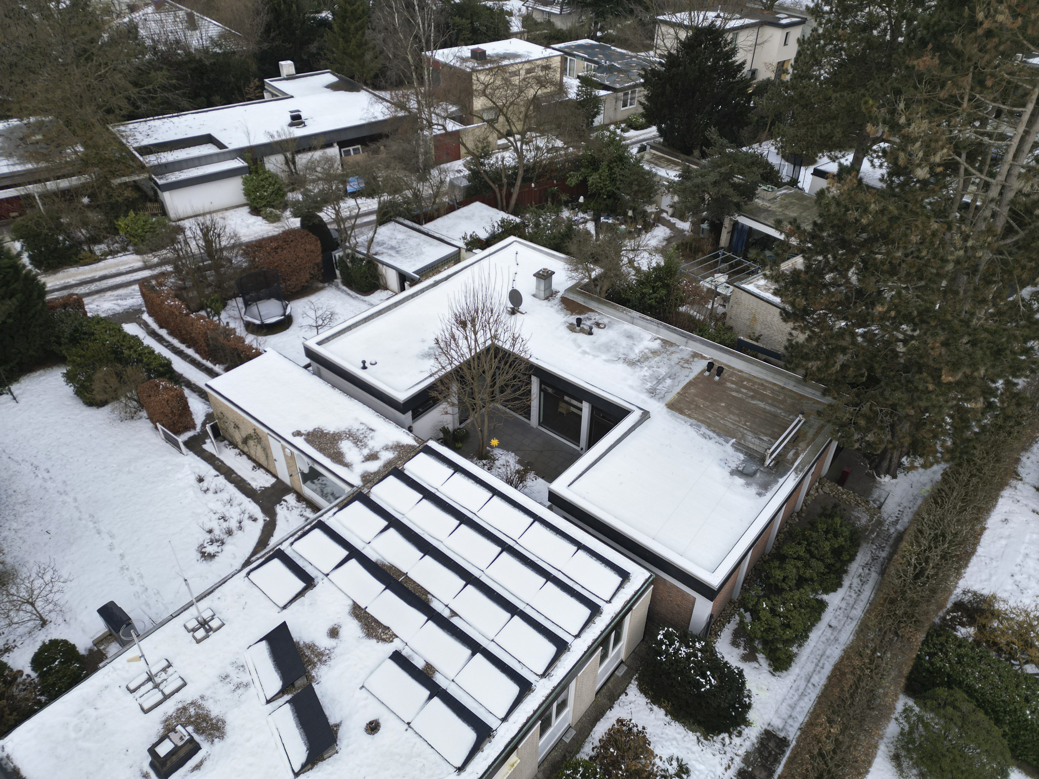 Hier erwartet Sie ein seltener Atrium-Bungalow aus dem Jahr 1963, der mit seinem modernen Charme und durchdachten Grundriss begeistert. Auf großzügigen 190 m² Wohnfläche verteilen sich fünf helle Zimmer – darunter drei Schlafzimmer, zwei Bäder, ein separates Gäste-WC und ein großzügiger Hauswirtschaftsraum. Besonders hervorzuheben sind die in regelmäßiger Abfolge angeordneten großen quadratischen Fensterelemente im Bauhausstil, die den gesamten Bungalow mit Licht durchfluten und eine außergewöhnlich freundliche Atmosphäre schaffen, die durch einen charmanten Kamin im Wohnbereich zusätzlich unterstrichen wird. Der offen gestaltete Wohnbereich mit Blick in den grünen Garten bildet das Herzstück dieses Hauses, während der separate Küchen- und Essbereich perfekte Möglichkeiten für gesellige Abende bietet. Hochwertiges Parkett und ein moderner Microzement-Boden im Wohn- und Flurbereich sorgen für stilvolle Akzente. Das Elternschlafzimmer punktet zusätzlich mit einer eigenen Ankleide. Die offene Gestaltung und die fließenden Übergänge zwischen den Räumen sorgen für ein besonders großzügiges und modernes Wohnambiente. Eine effiziente Wärmepumpe aus dem Jahr 2011 sowie eine komfortable Fußbodenheizung unterstreichen den zeitgemäßen Wohnkomfort. Der Bungalow ist seit 2019 vermietet und erzielt derzeit eine Nettokaltmiete von 2120 €. Eine Eigennutzung ist unter Einhaltung der gesetzlichen Regelungen möglich. Das Wohnhaus und das 480 m² große Grundstück sind geprägt von Teich, Terrassen, und Innenhof; eingebettet in alten Baumbewuchs in ruhiger und familienfreundlicher Lage in Hamburg-Rissen. Ein Haus, das mit Helligkeit, Großzügigkeit und einer durchdachten Architektur begeistert.