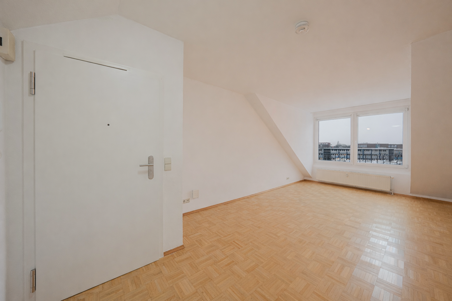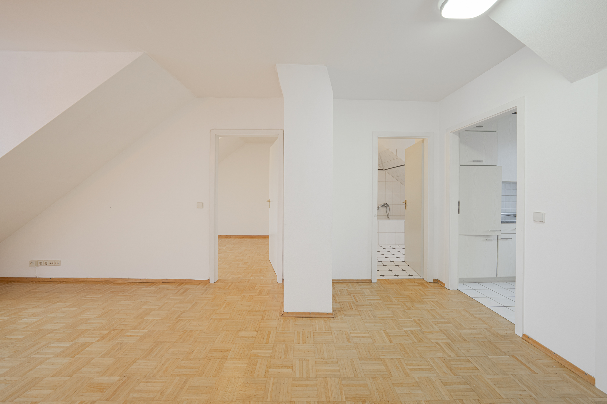 Der offen gestaltete Wohn- und Essbereich bildet das Herzstück der Wohnung und überzeugt durch großzügige Fensterflächen, die für ein helles, freundliches Ambiente sorgen. Charakteristische Dachschrägen verleihen den Räumen eine individuelle Note und unterstreichen den wohnlichen Charme.
