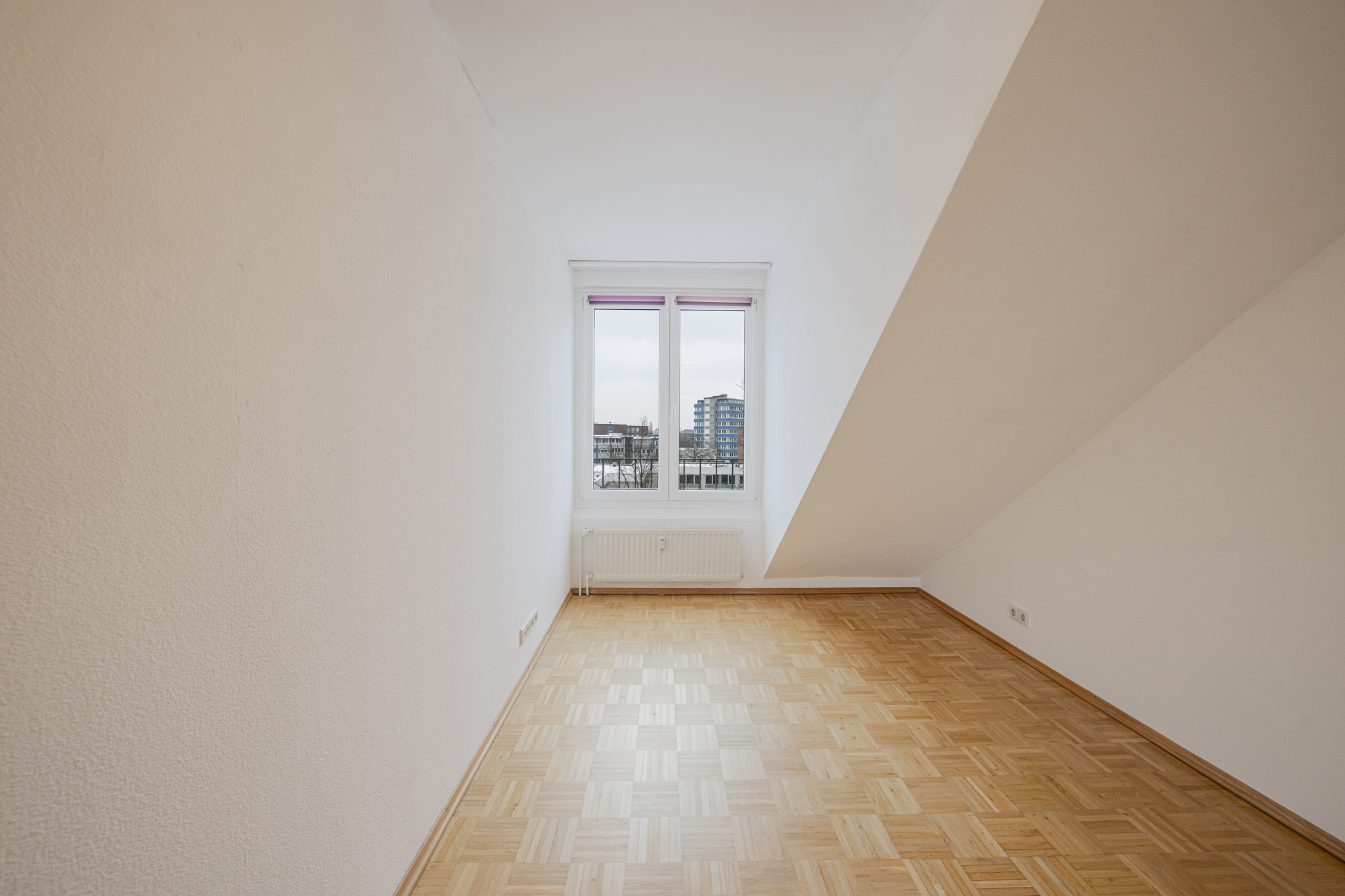 Das separate Schlafzimmer bietet einen ruhigen Rückzugsort. In Wohnbereich, Flur und Schlafzimmer ist gepflegtes Stäbchenparkett verlegt, das eine warme Atmosphäre schafft.