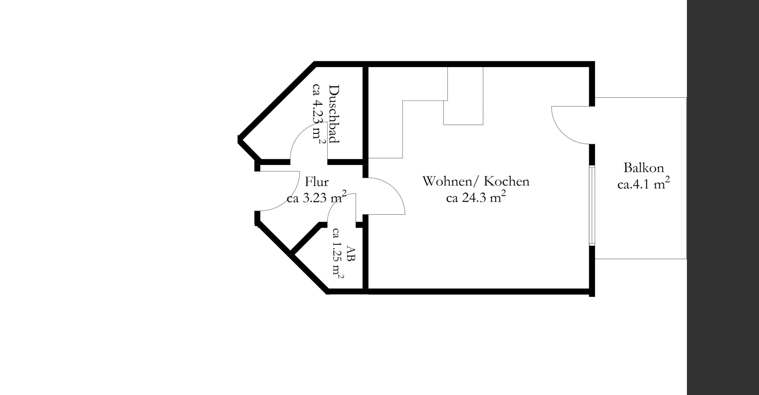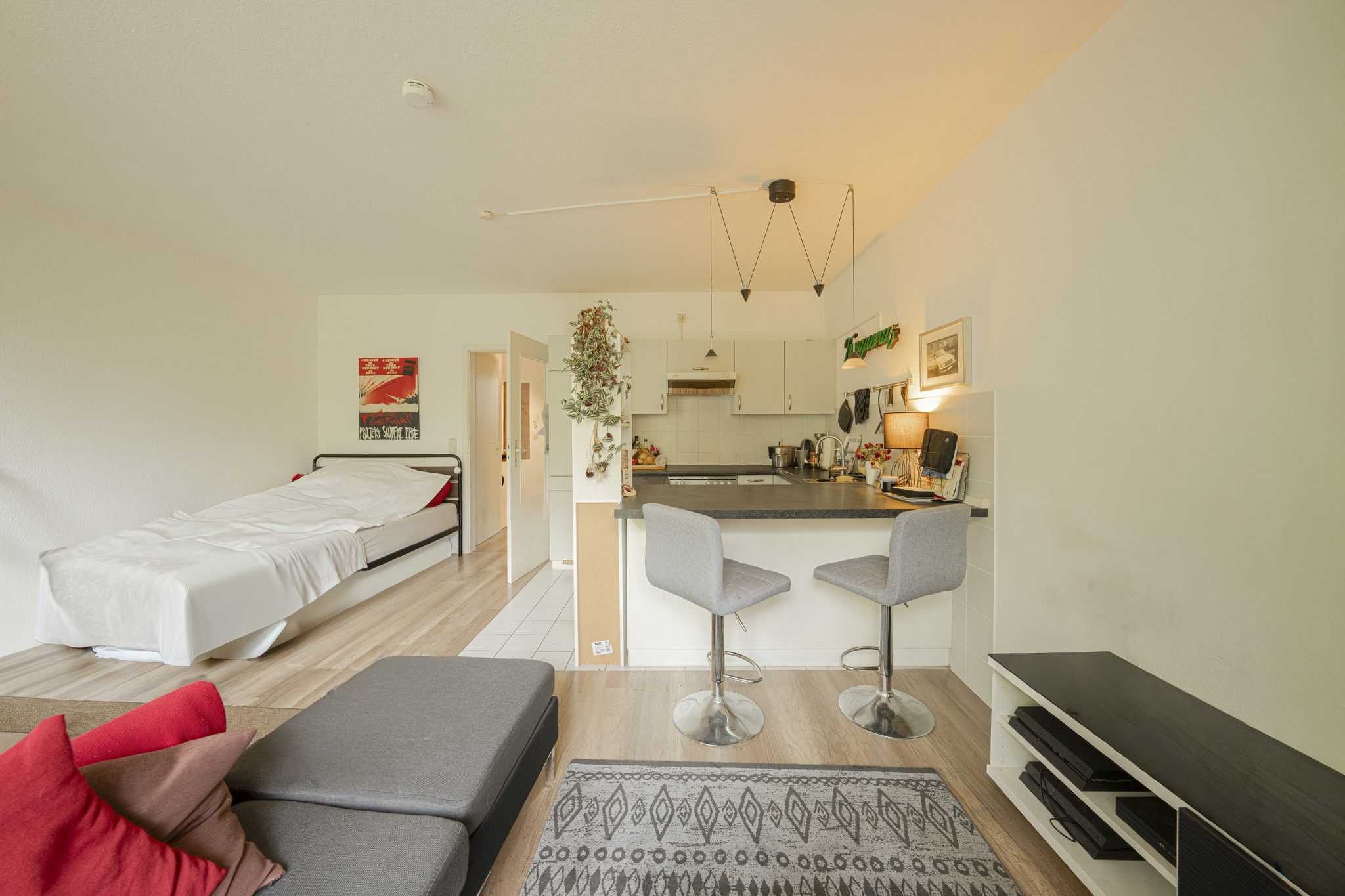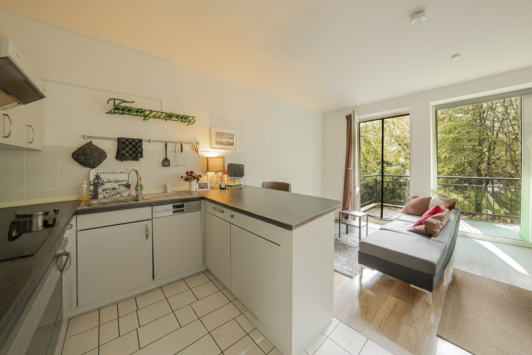 Der offen gestaltete Wohnbereich samt kompakter Küchen überzeugt durch einen klugen Schnitt und zahlreiche Einrichtungsoptionen. Dank großer Fenster und direktem Zugang zum Balkon genießt man viel Tageslicht und einen Ausblick ins Grüne. Der praktische Thekenbereich trennt die Küche harmonisch ab. Wohn-/Ess-/ und Schlafbereich können durch den Grundriss super miteinander harmonieren. Auch hier findet sich ein heller Holzboden wieder, der das Zimmer perfekt abrundet.