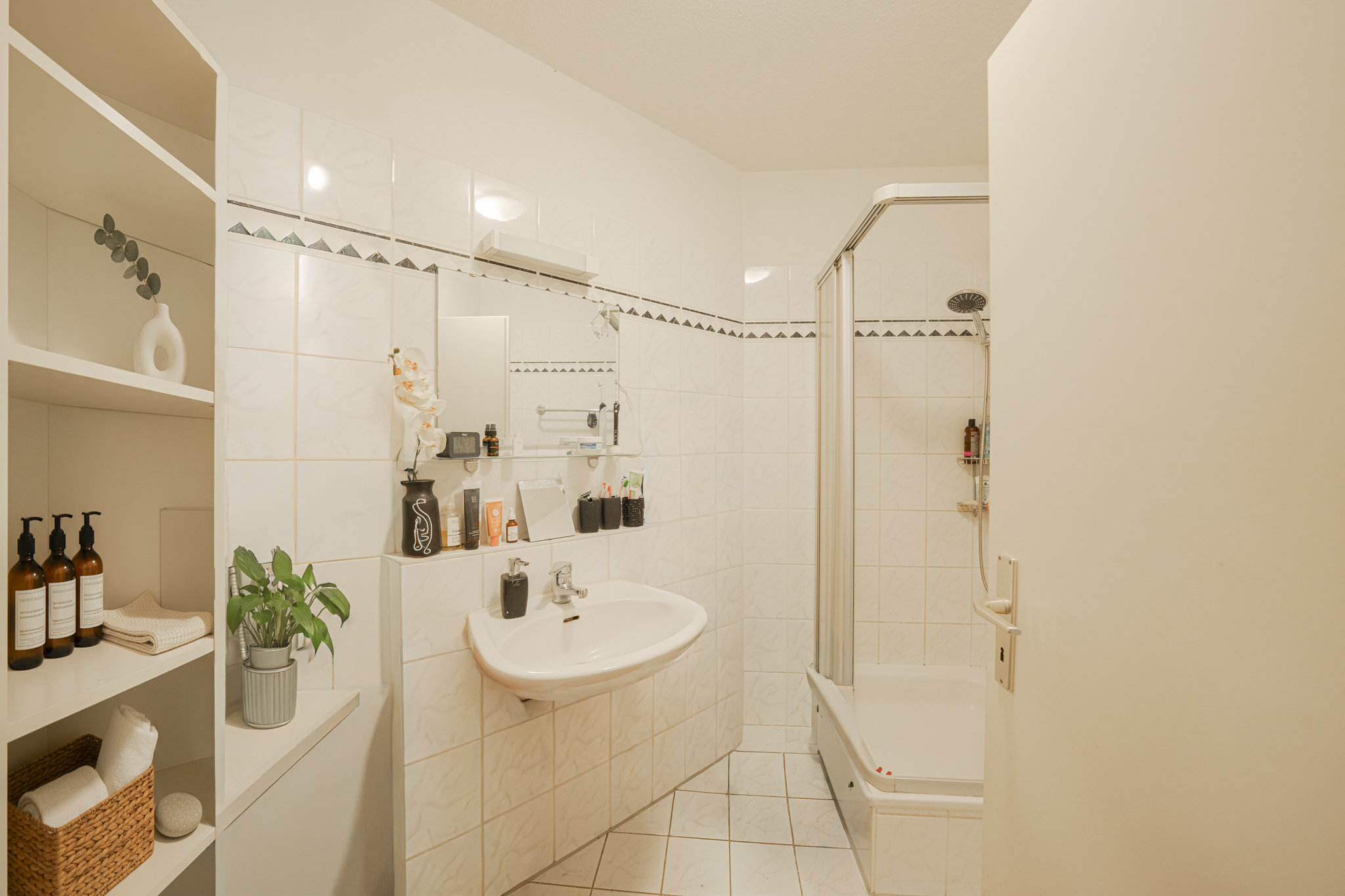 Diese gepflegte Wohnung in einem Haus aus dem Jahr 1994 empfängt Sie mit einem großzügigen, hellen Flur. Weiße Wände und der edle Boden schaffen ein einladendes Ambiente, das zur vielseitigen Gestaltung einlädt. Das klassisch weiß geflieste Bad besticht durch eine gepflegte Ausstattung – Dusche, sowie freundliche Wand- und Bodenfliesen sorgen für zeitlose Eleganz und ein sauberes Raumgefühl. Ebenfalls vom Flur aus zugänglich befindet sich ein Abstellraum, der gute Staufläche bietet um täglich genutzte Gegenstände einfach unterzubringen.