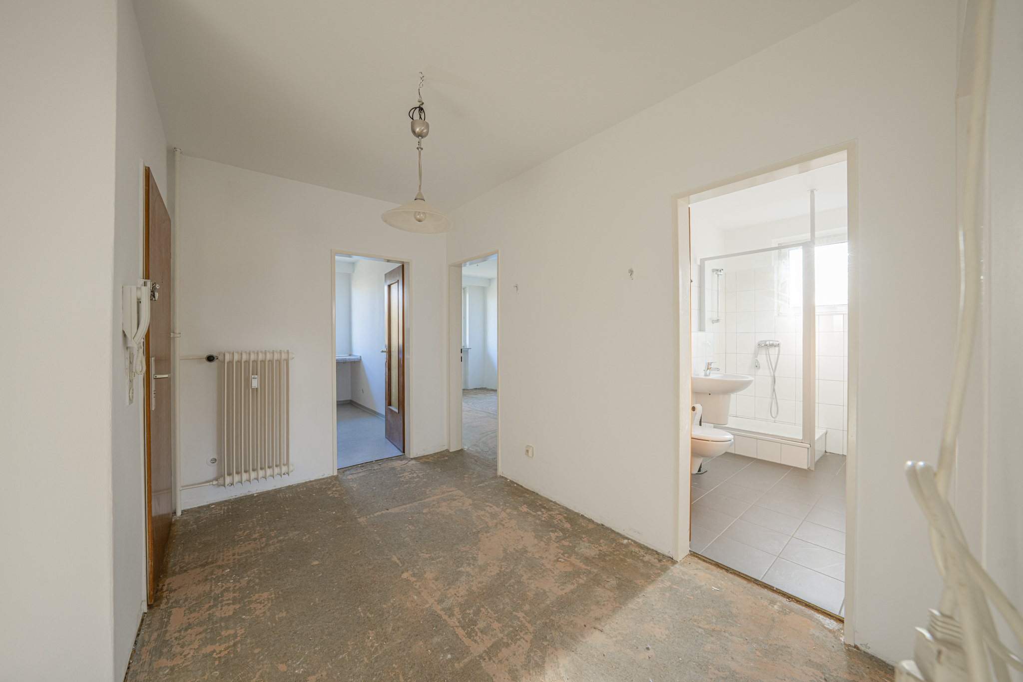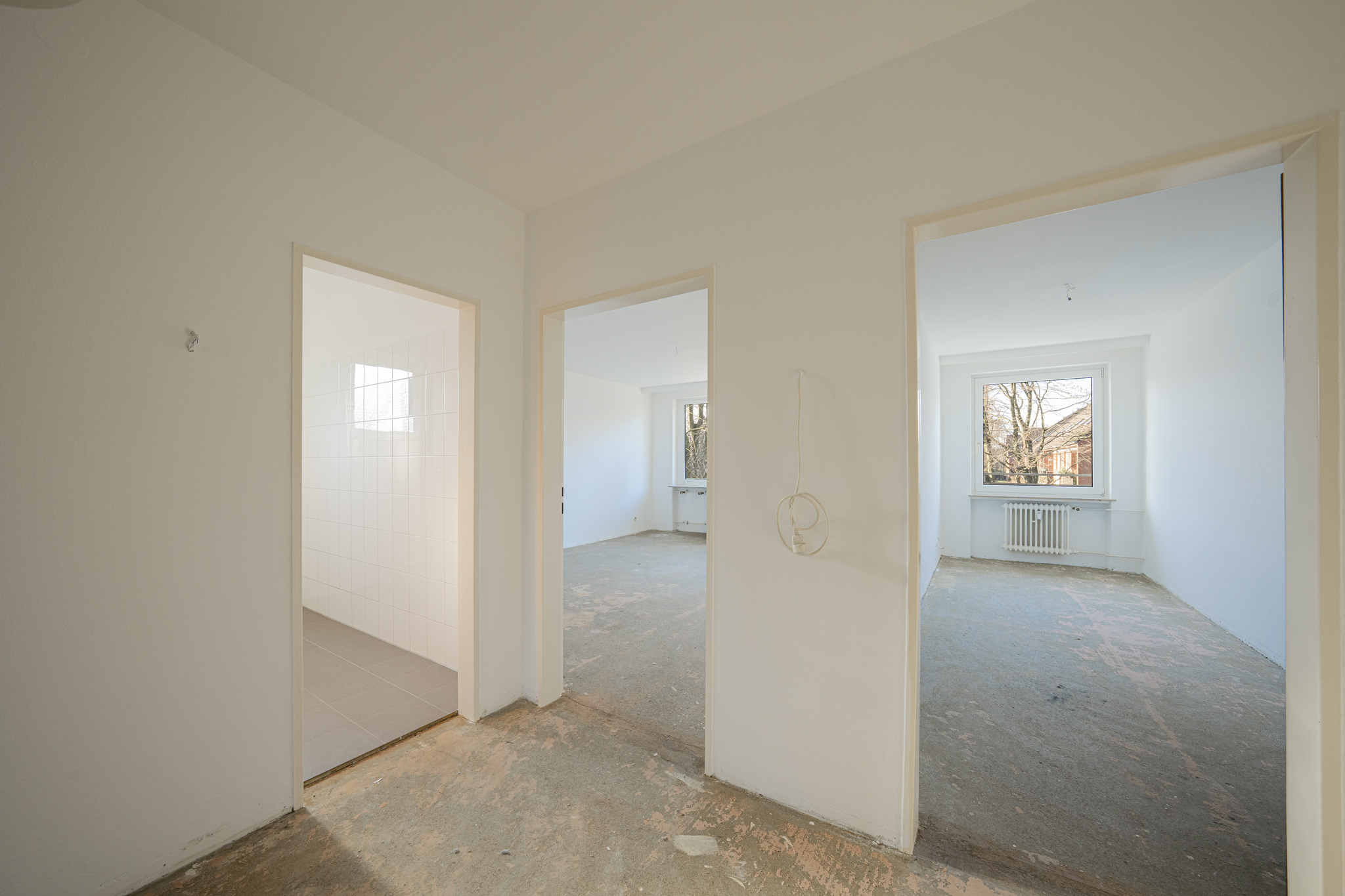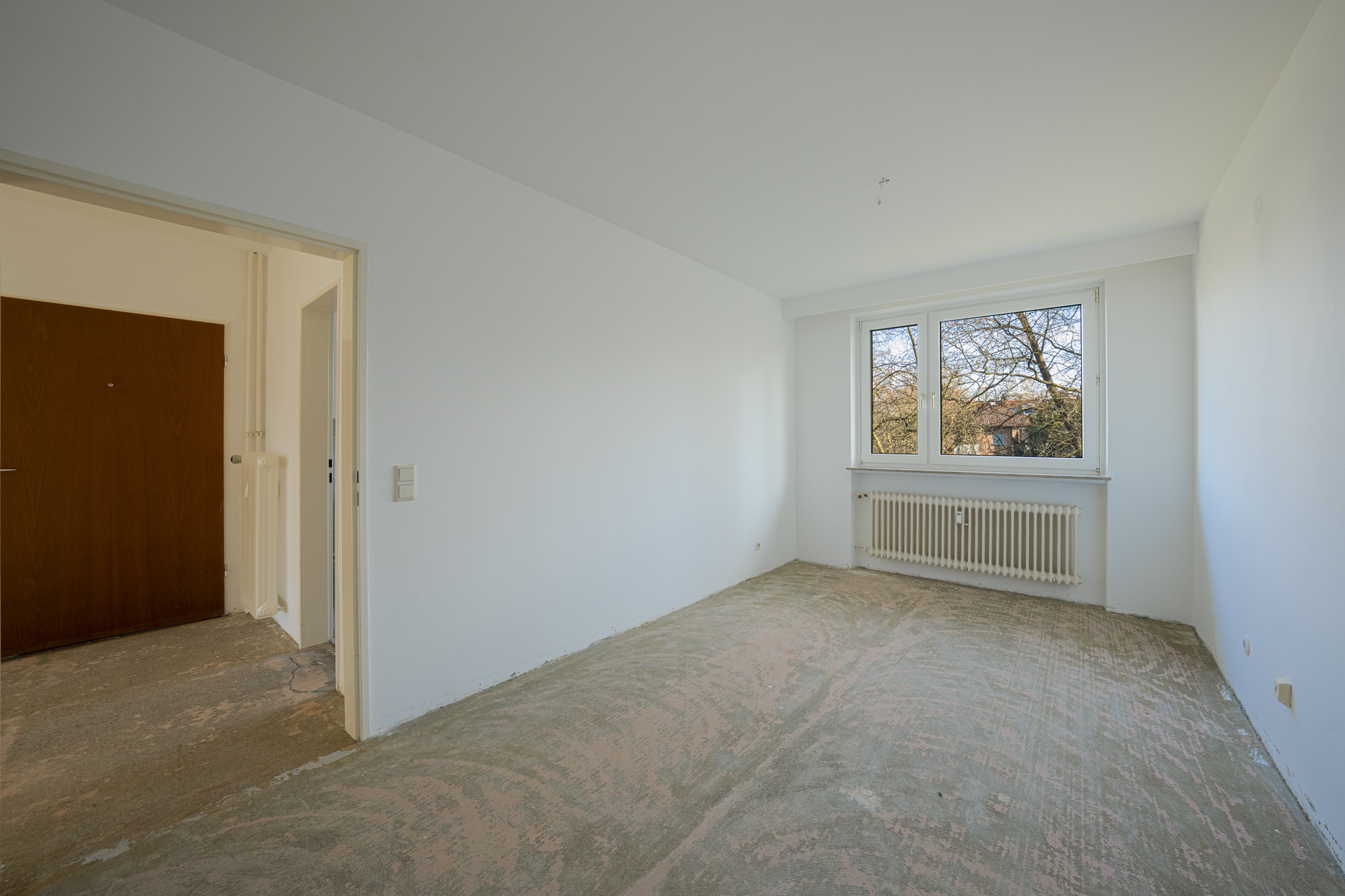 Ein weiteres Zimmer eröffnet flexible Nutzungsmöglichkeiten – ob als Arbeits-, Gäste- oder Ankleidezimmer. Ergänzt wird das Raumangebot durch eine großzügige Küche mit Platz für Kochideen und einen Flur, der sich perfekt für eine stilvolle Garderobe eignet. Die Wohnung wurde in 2025 teilweise renoviert und verfügt über doppelt verglaste Fenster aus dem Jahr 1993. Die bisherigen Bodenbeläge wurden bereits entfernt, sodass der Boden optimal vorbereitet ist und individuelle Anpassungen direkt umgesetzt werden können.